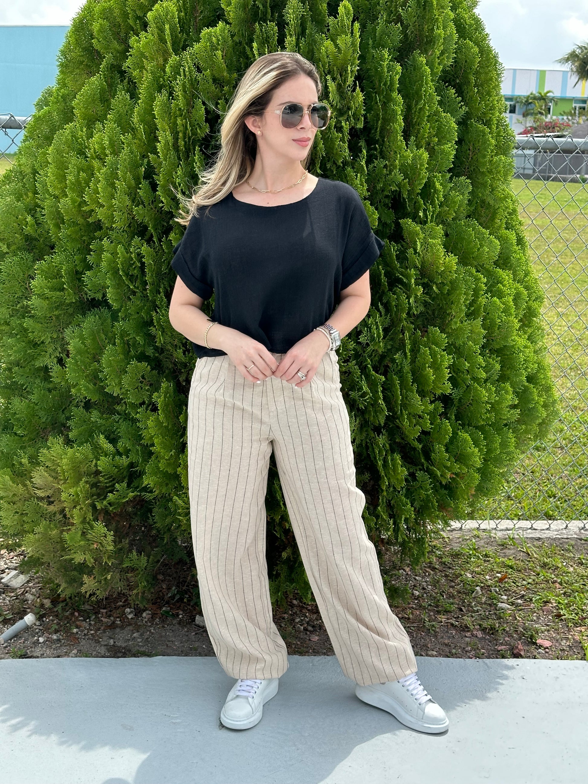 Linen front creases pants. Model wearing small