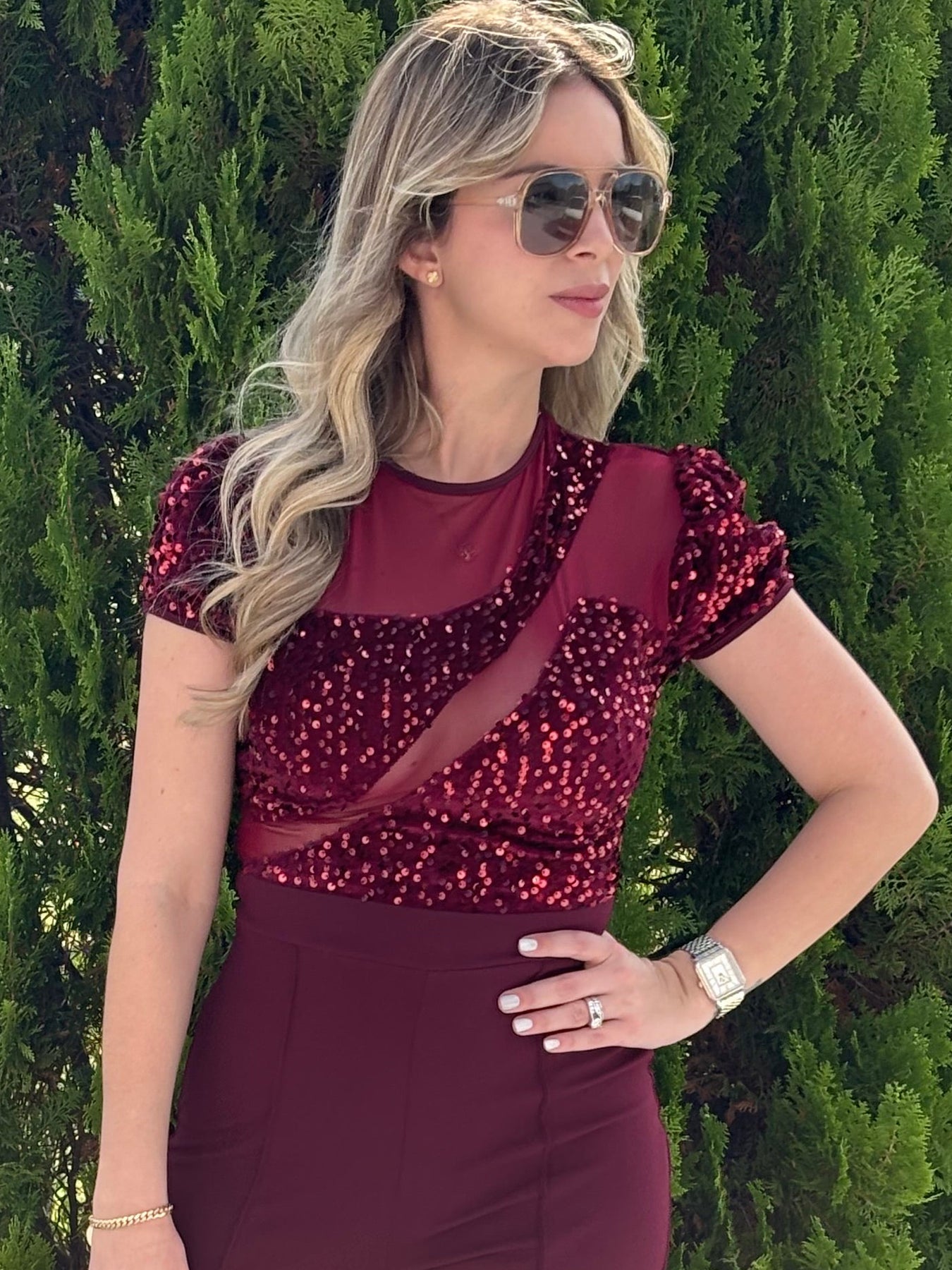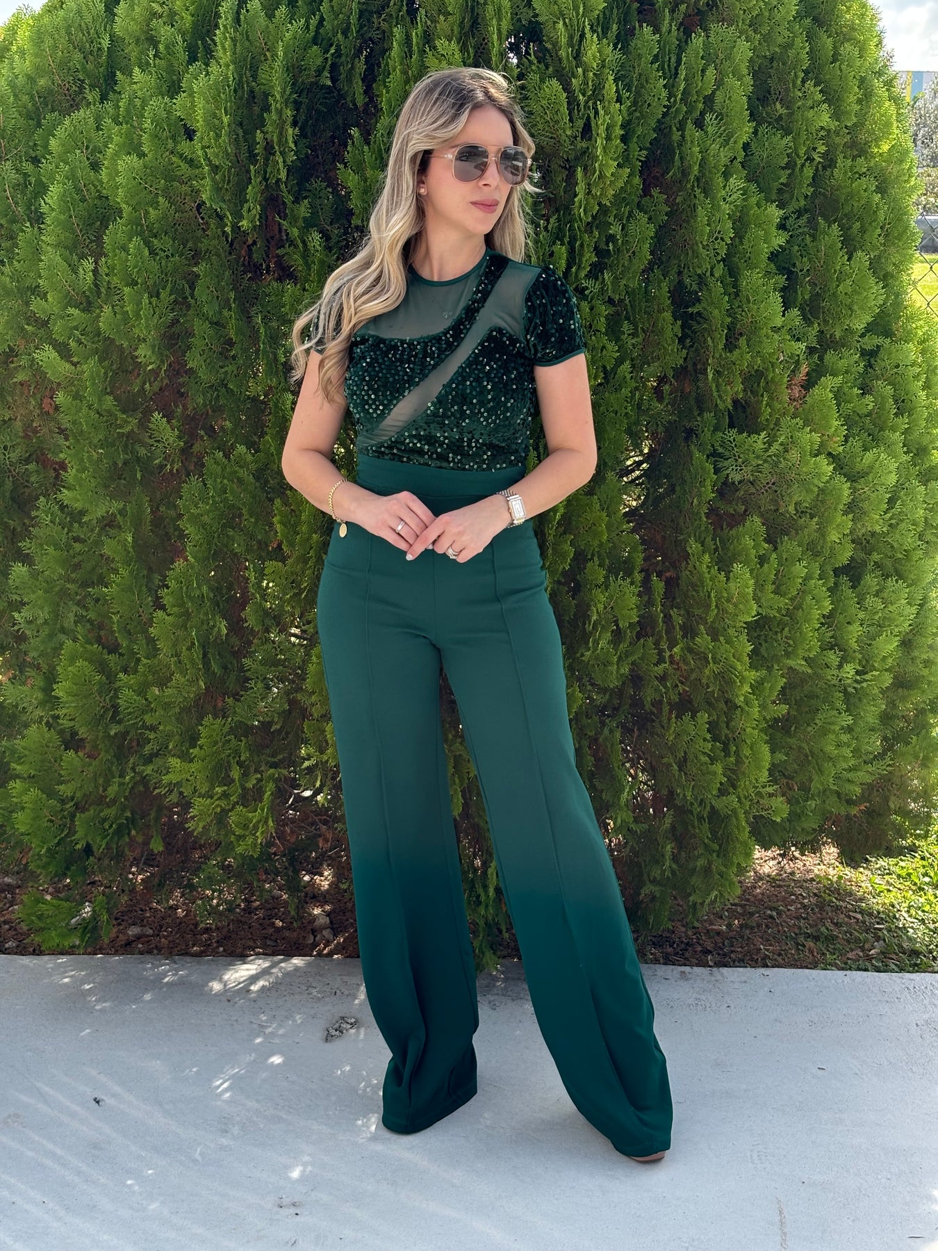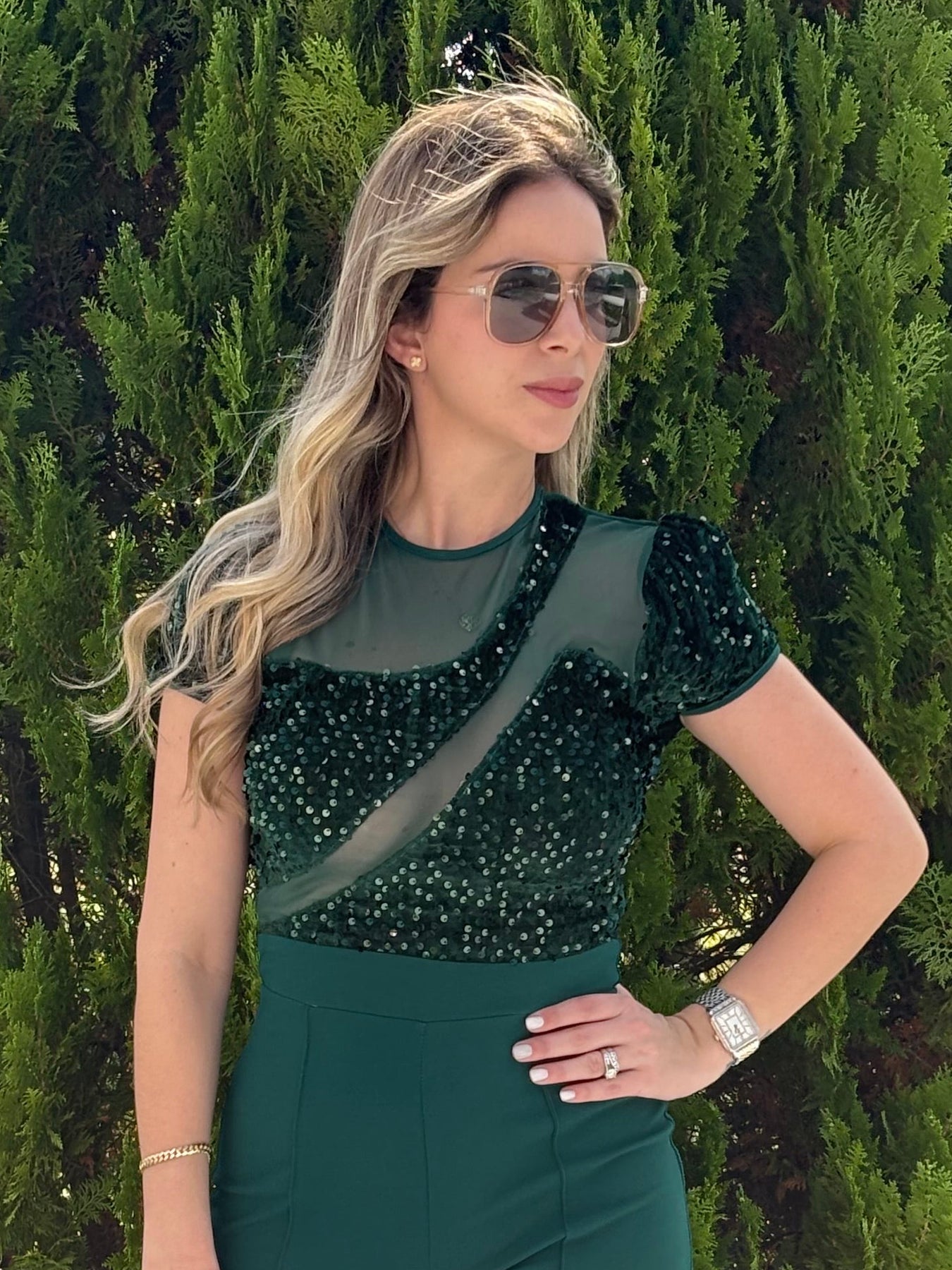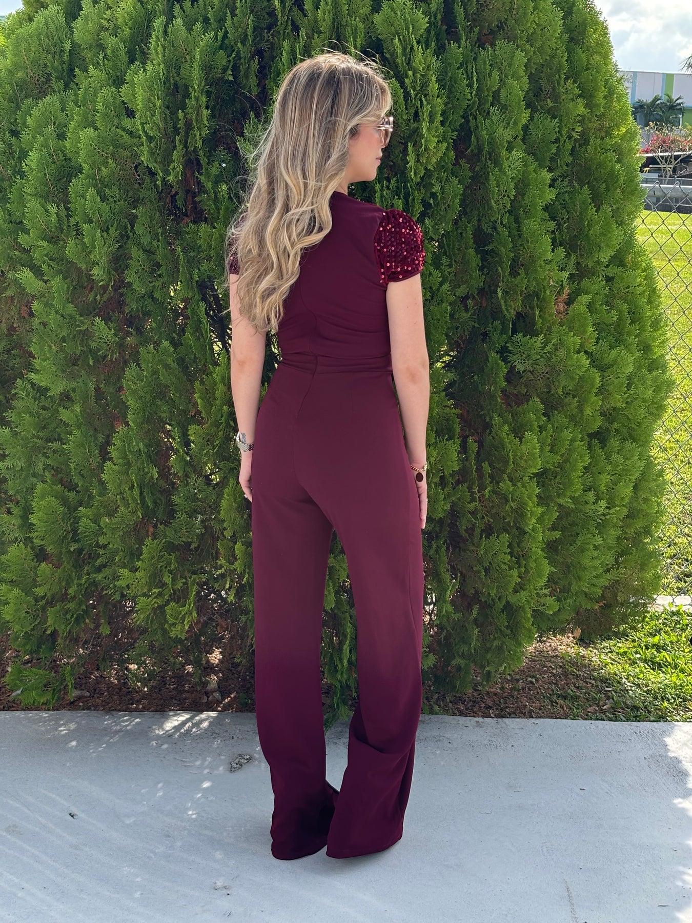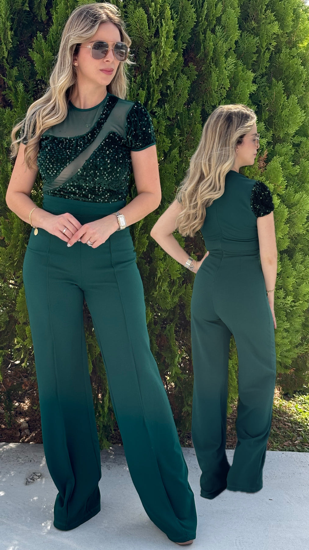 Short sleeve sequin top jumpsuit. Model wearing small . True to size, full stretch