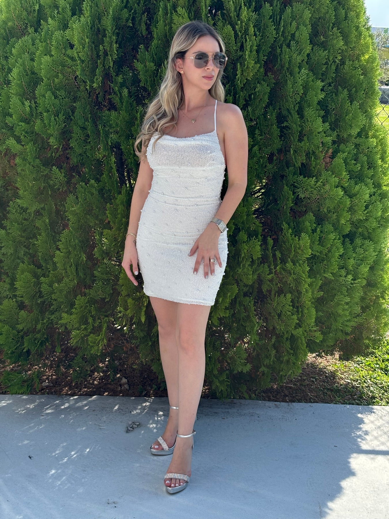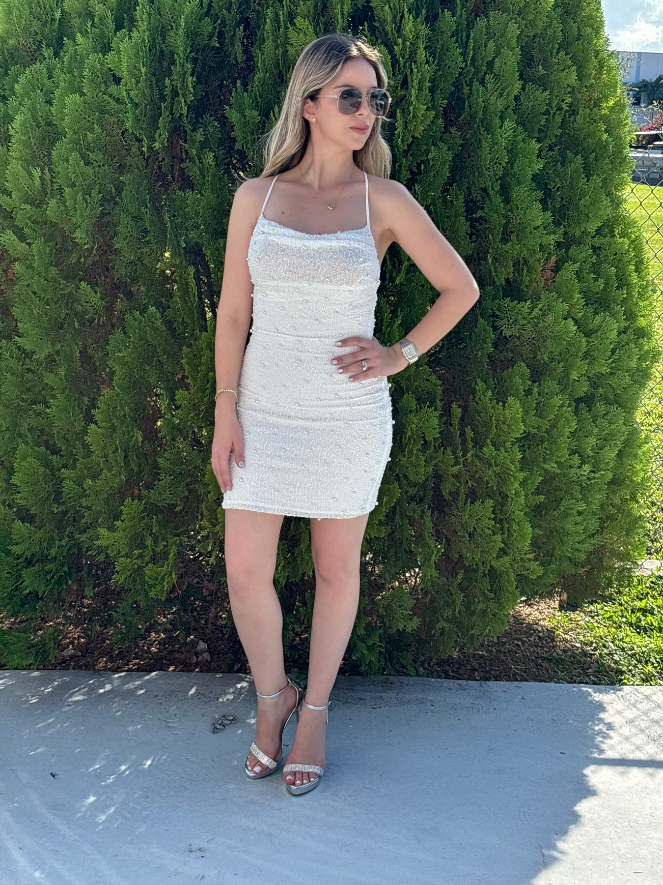 Thin cross adjustable straps mini dress with pearls. Model wearing size small, dress has full stretch