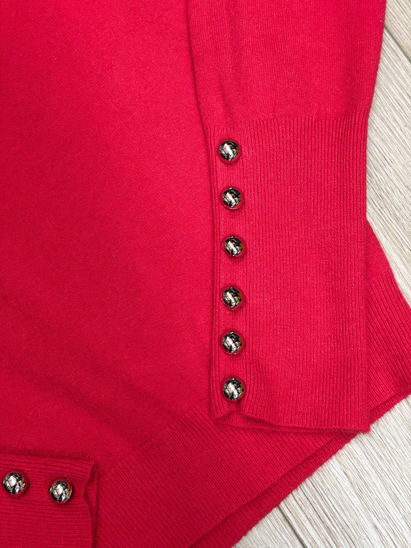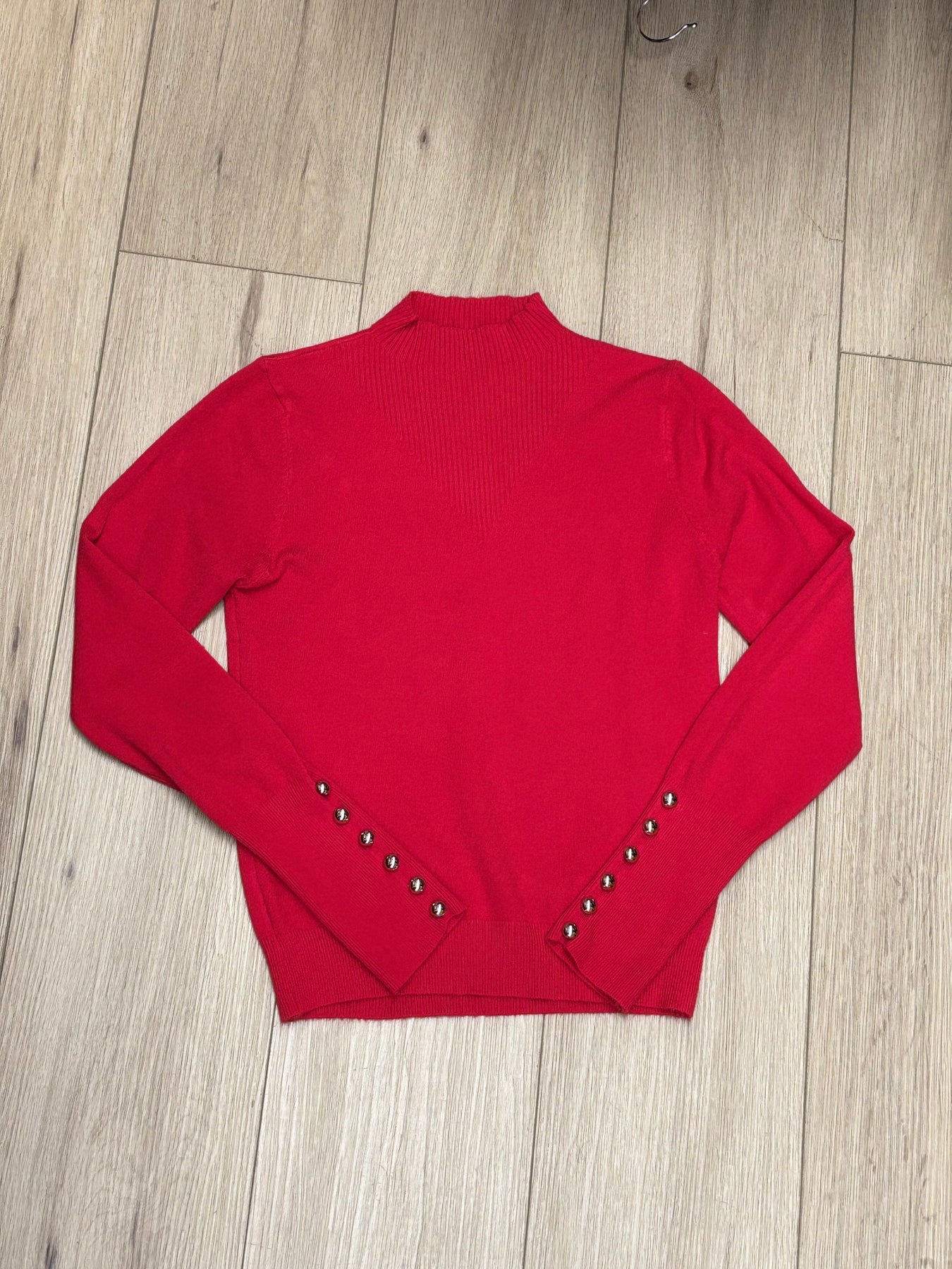 Long sleeve sweater with button detail at cuffs. Model wearing size small. True to size, full stretch