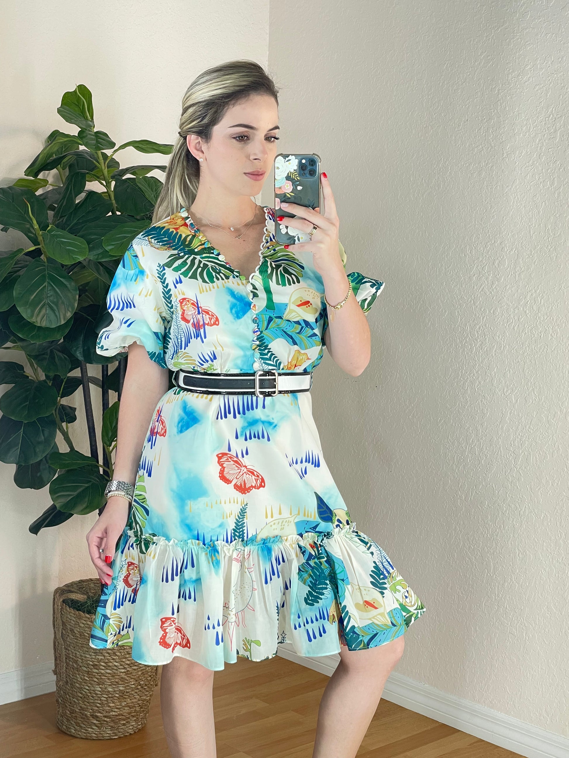 short sleeve dress. Belt included. Model wearing small